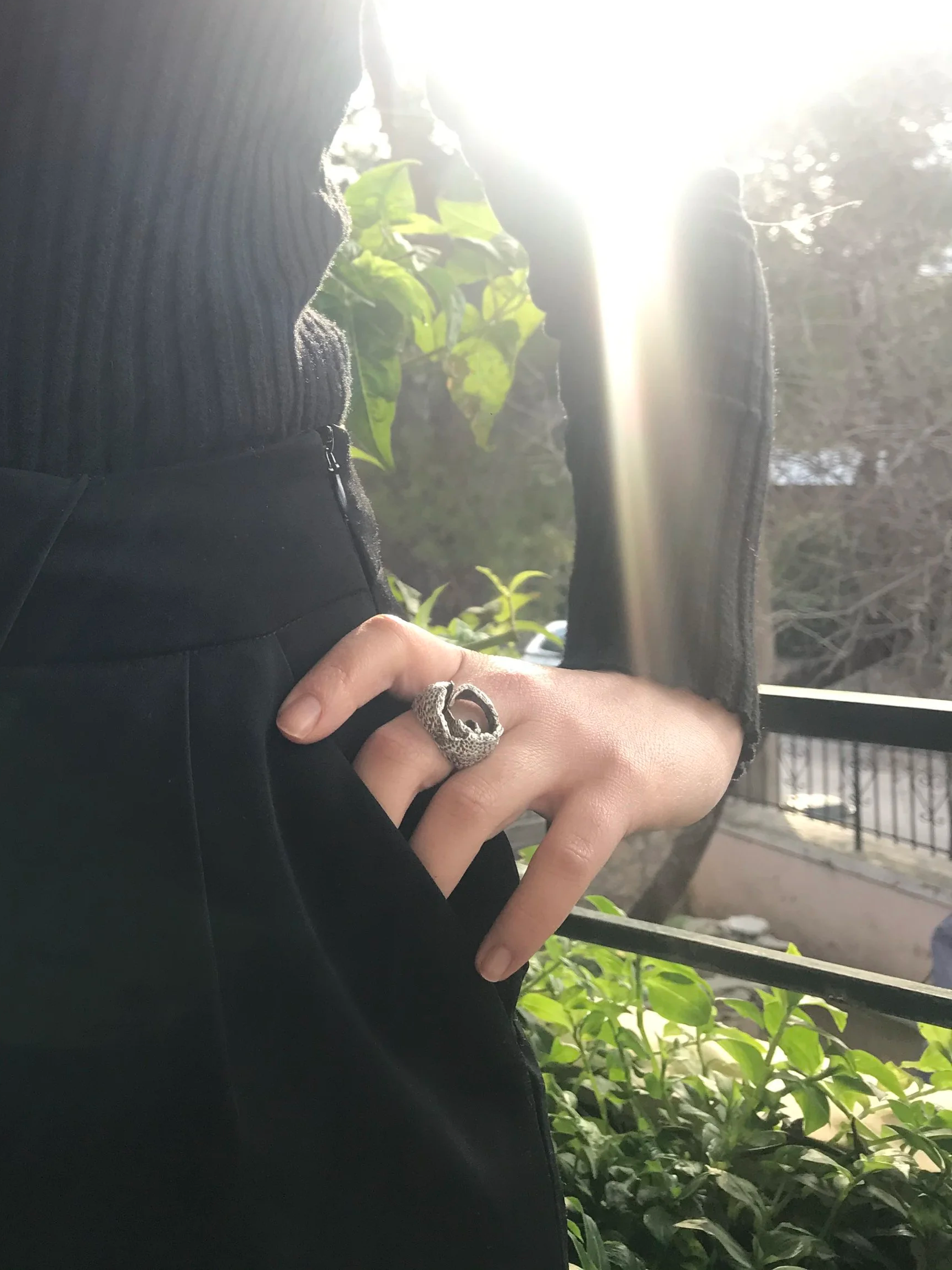 Designed to be worn in two orientations, the piece shifts with the wearer — from a more open, linear silhouette to a compact, sculptural presence. This duality allows the ring to adapt, much like the landscape that inspired it.